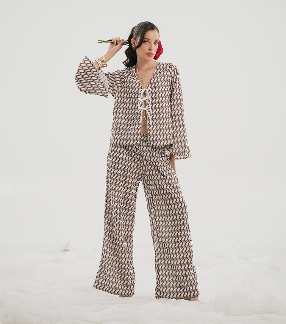 Conjunto de blusa manga larga con escote en V y amarre frontal, combinado con pantalón de silueta amplia. Su estampado aporta un toque moderno y elegante, ideal para un look versátil que se adapta a diferentes momentos del día.