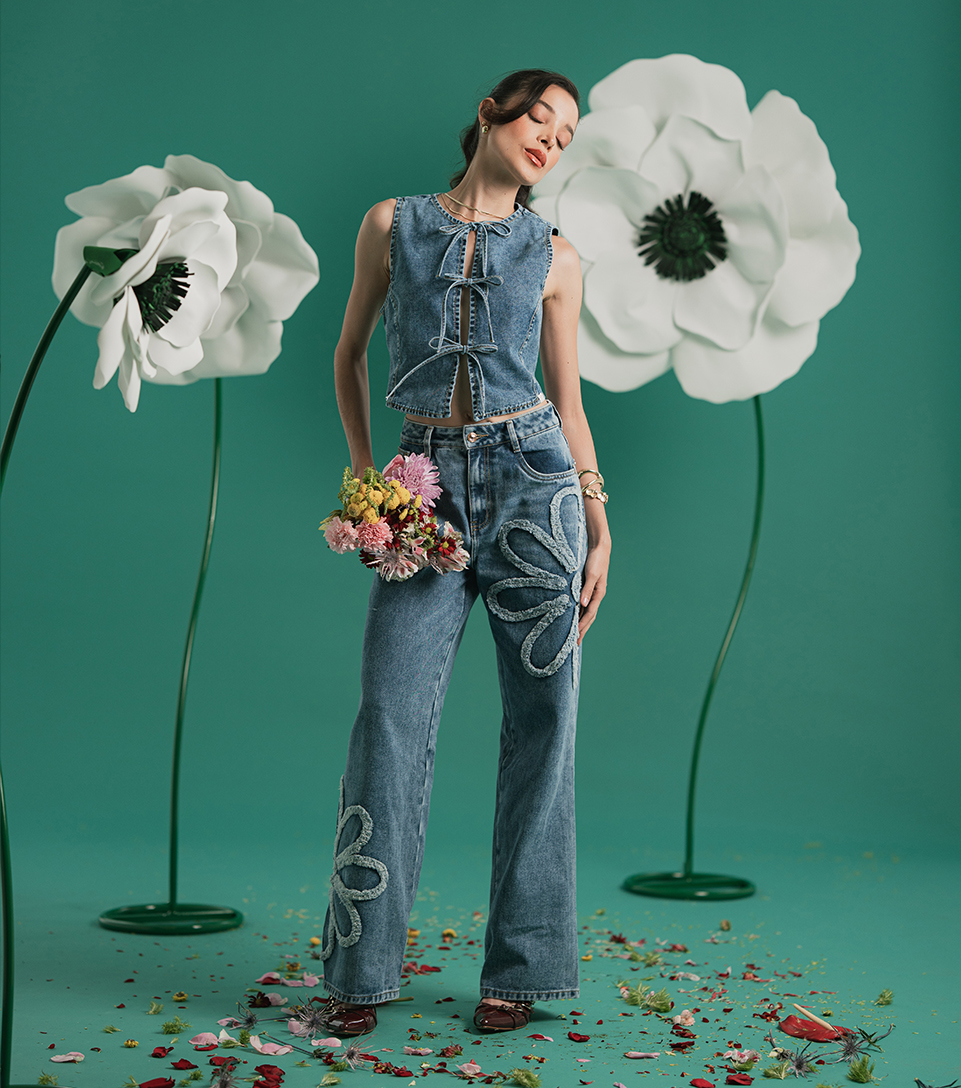 Conjunto denim compuesto por top sin mangas con lazos frontales y pantalón de corte recto con aplicaciones florales en relieve que aportan textura y protagonismo. El acabado en azul clásico se complementa con accesorios sutiles, creando un look fresco, artístico y con esencia primaveral.