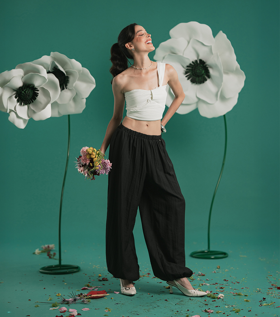 Top blanco asimétrico de textura plisada que estiliza la silueta, combinado con pantalón negro de corte amplio y caída fluida que aporta movimiento y elegancia natural. Se complementa con tacones blancos bajos y accesorios delicados para un acabado sutil y femenino.