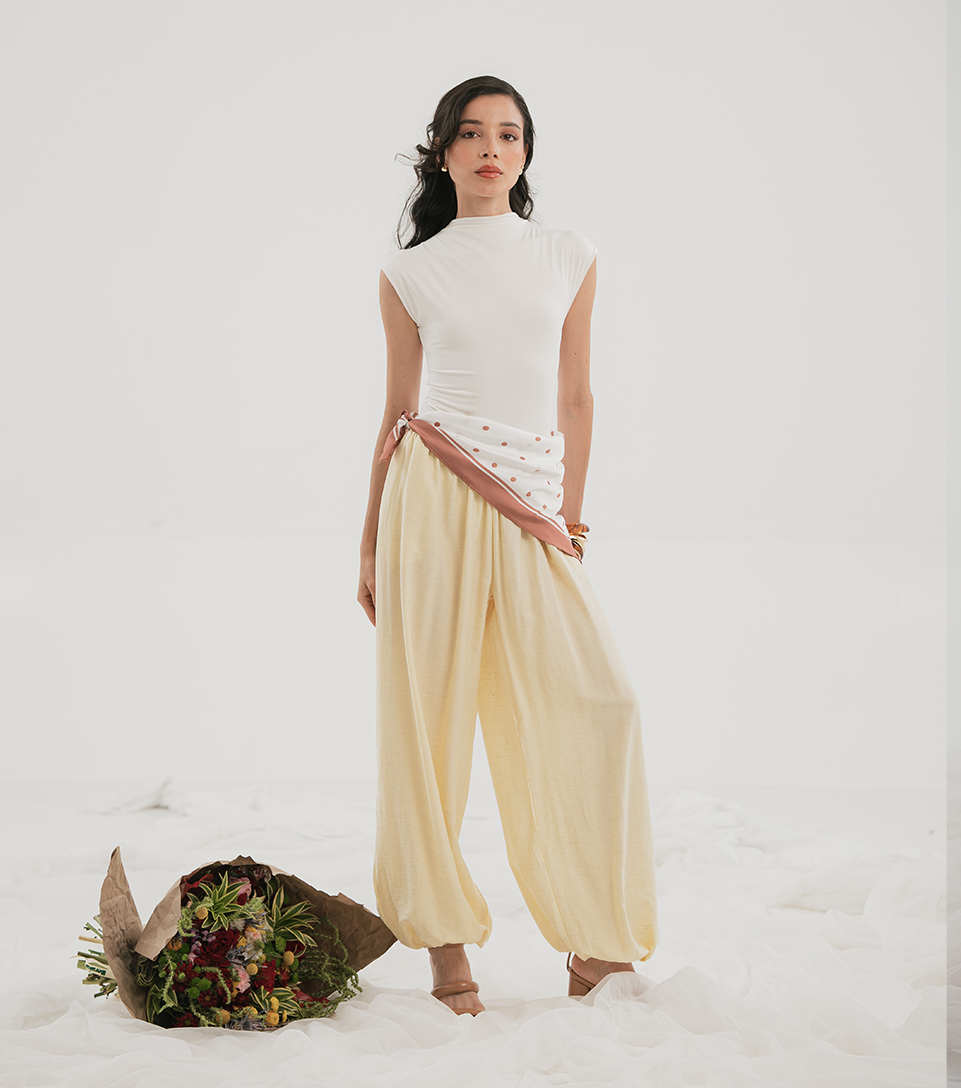 Un Look delicado y elegante que combina un body blanco sin mangas de corte limpio con un pantalón largo en tono amarillo suave. El pañuelo con estampado sutil anudado a la cintura añade un detalle femenino y armonioso, creando un estilo ligero y sofisticado.