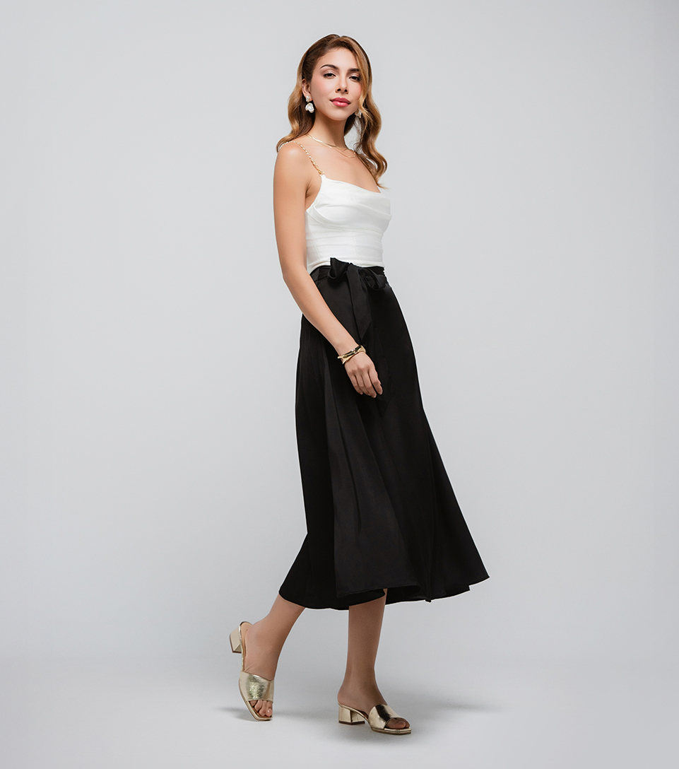 lusa con escote drapeado y silueta tipo corsé que realza una presencia segura.Se combina con una falda midi negra que aporta equilibrio y elegancia.Un look que mezcla suavidad y poder en cada detalle.