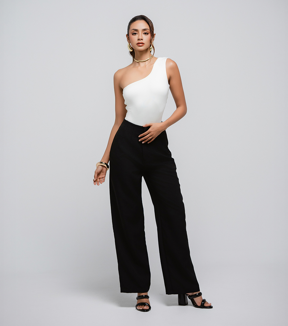 Body con escote profundo en la espalda y broches ajustables que moldean con precisión.Acompañado de un pantalón negro de bota recta que aporta linealidad y carácter. Un conjunto que equilibra sensualidad y fuerza con impecable intención