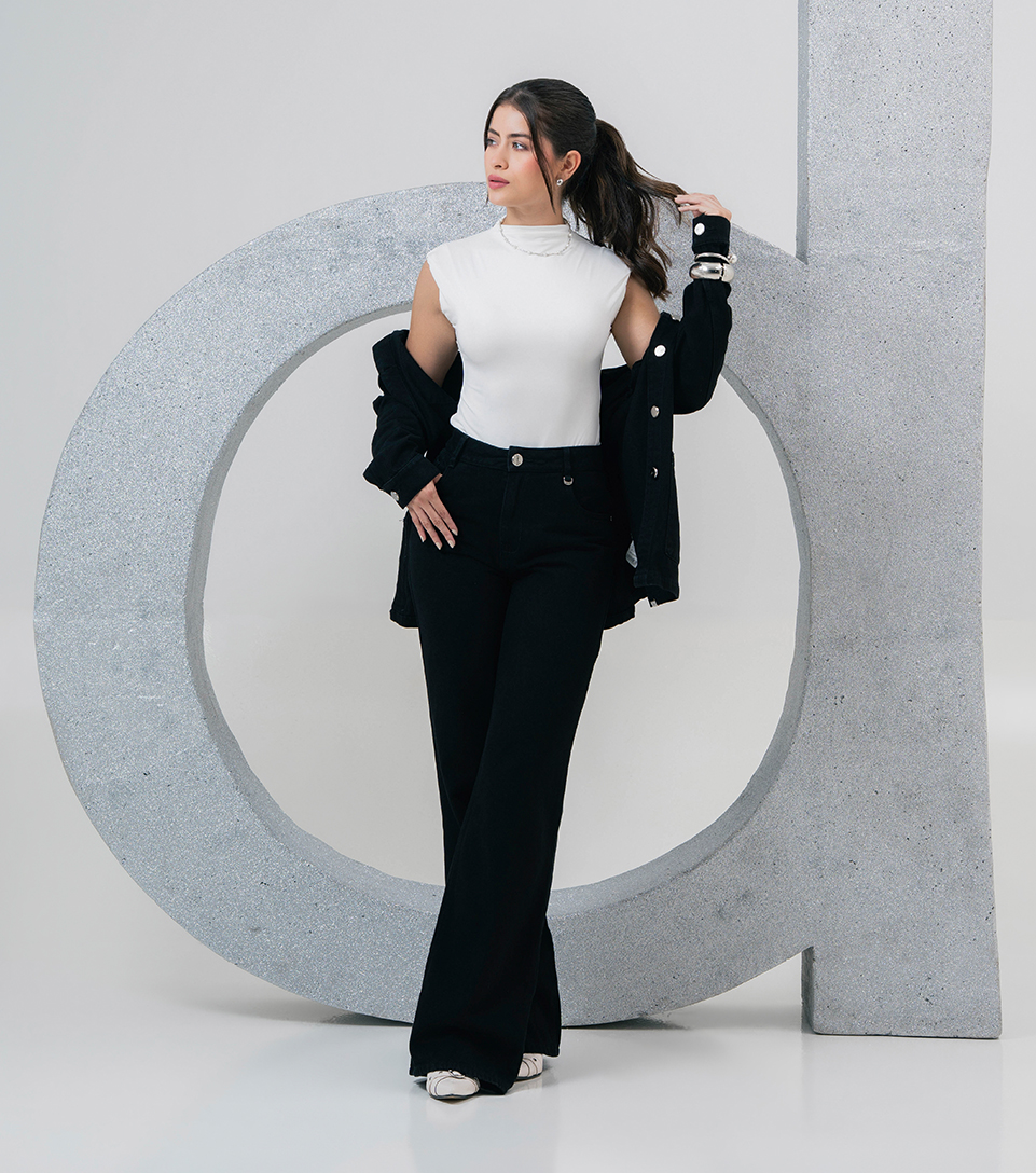 Un conjunto de alto contraste que redefine el minimalismo sofisticado. Con un top blanco nítido de cuello alto y pantalones negros de pierna ancha para una silueta limpia y fluida. Llevada con estilo sobre los hombros, la chaqueta negra añade un toque arquitectónico y moderno, complementado por brazaletes metálicos plateados que aportan un pulido final.