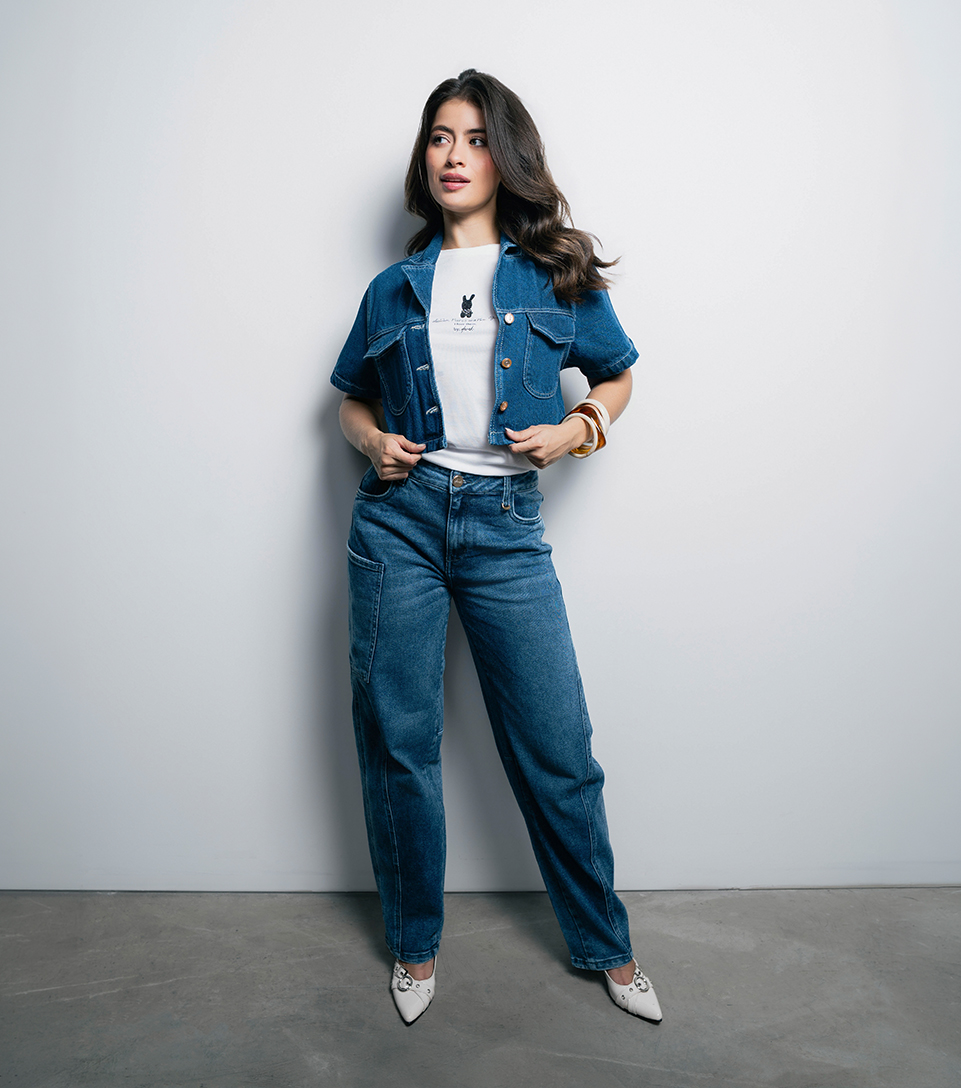 Una versión moderna y elegante del estilo utilitario casual. Este conjunto coordinado de mezclilla de lavado medio cuenta con una chaqueta corta con grandes bolsillos de parche y pantalones de pernera ancha a juego. Una camiseta blanca impecable con una discreta y divertida ilustración de un conejo añade carácter. Los accesorios elevados, como los tacones de punta blancos, crean un look sofisticado perfecto para el día a día.