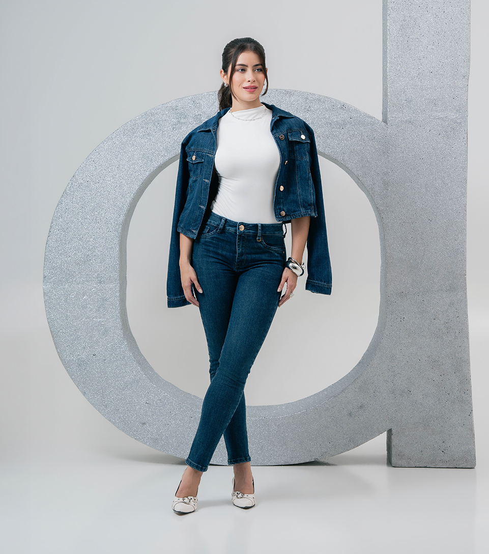 Un sofisticado conjunto coordinado de mezclilla oscura que define la silueta. Este look presenta una chaqueta cropped llevada con estilo sobre los hombros, una camiseta blanca limpia para un contraste nítido y jeans skinny a juego. Zapatos de tacón de punta blancos con detalles metálicos añaden un acabado pulido a este conjunto de inspiración urbana y arquitectónica.